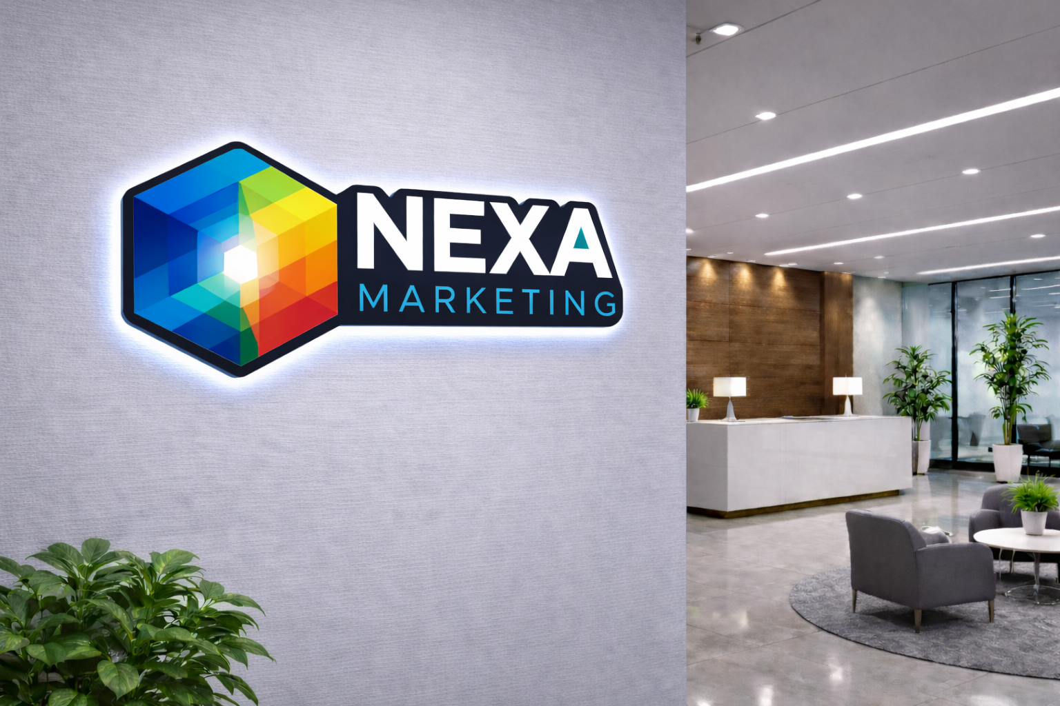 - Office reception areas and primary lobby logo displays